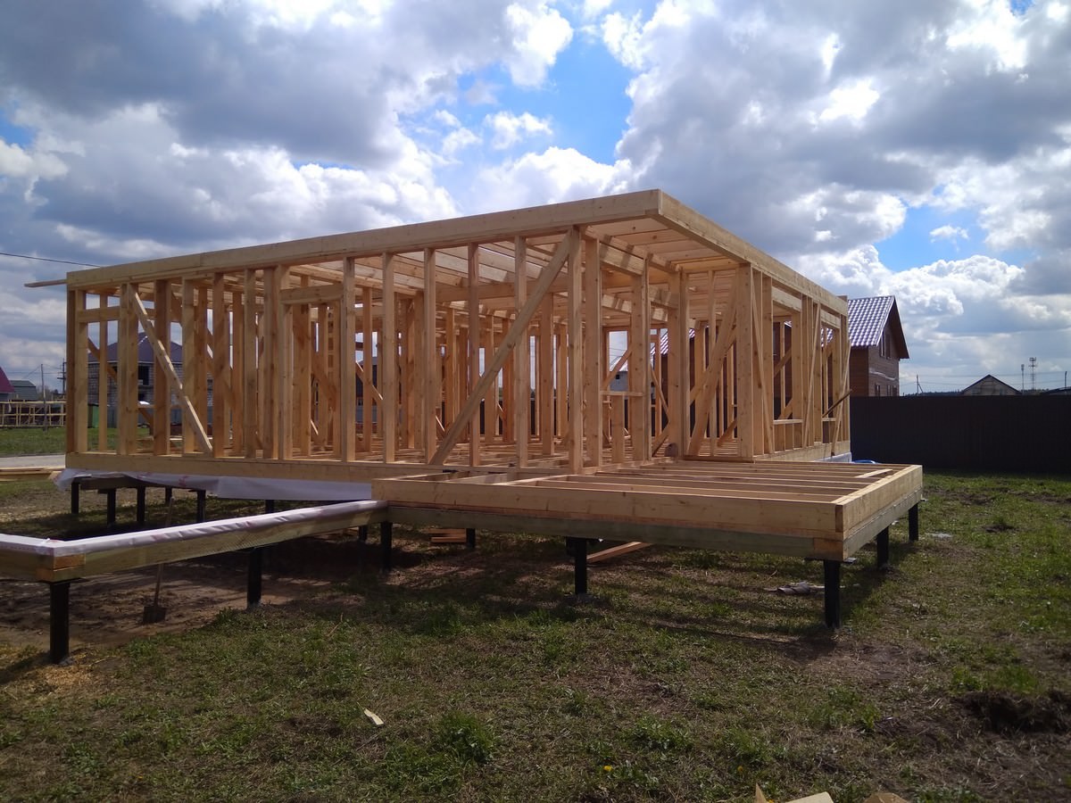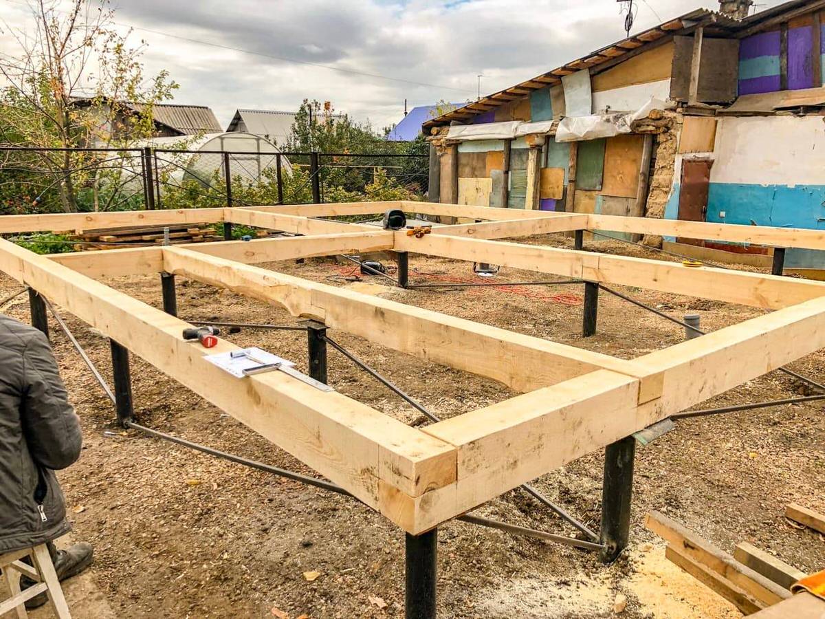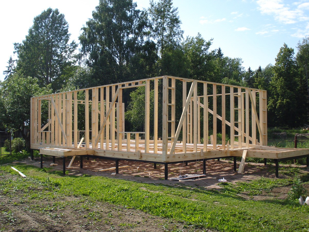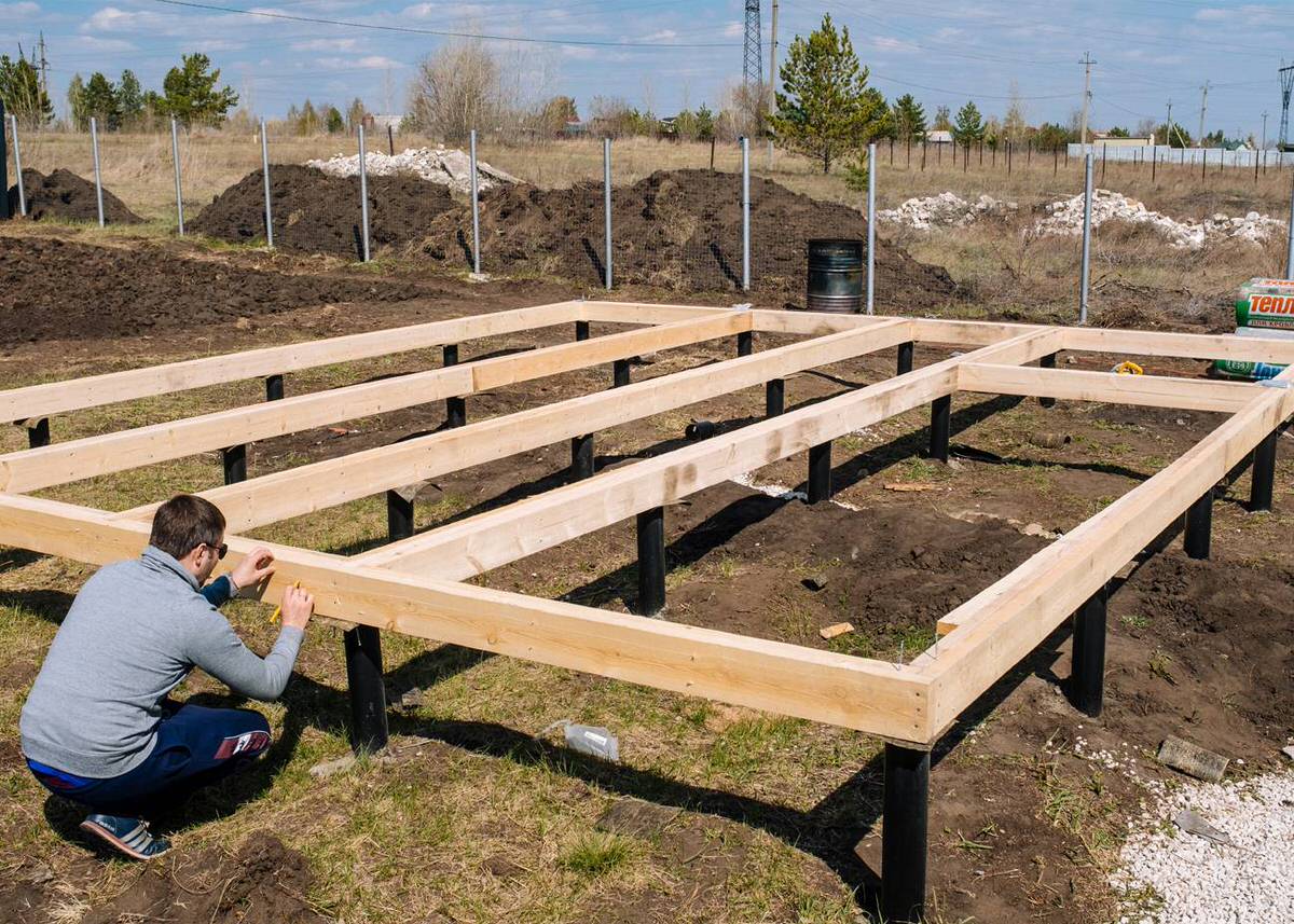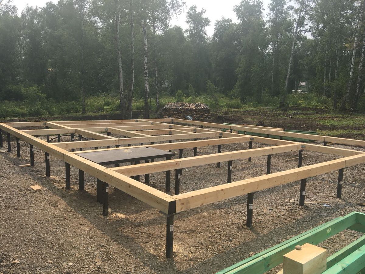 Вначале вкручиваются угловые опоры, затем столбы по периметру и в местах примыкания несущих стен и внутренних перегородок.